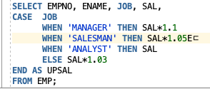 | SELECT EMPNO, ENAME, JOB, SAL, CASE JOB WHEN 'MANAGER' THEN SAL*1.1 WHEN 'SALESMAN' THEN SAL*1.05Eㄷ WHEN 'ANALYST' THEN SAL ELSE SAL*1.03 END AS UPSAL FROM EMP; |