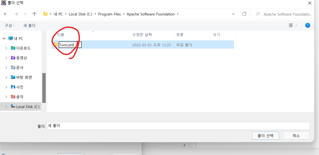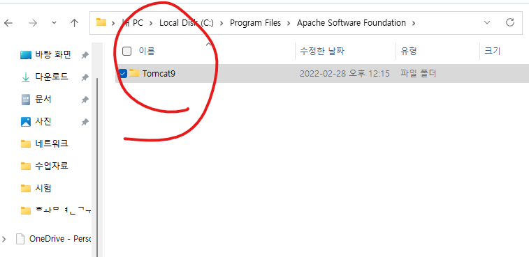 Program Files-Apache Software foundation(원래 위치)에 톰캣 폴더도 다시 생성 (경로 지정을 위해)