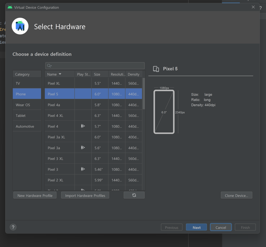 우리 휴대폰 액정 크기가 다르듯 픽셀에 따라 화면 크기가 다르니 시뮬레이션할 화면을 알아서 선택해주면 된다.