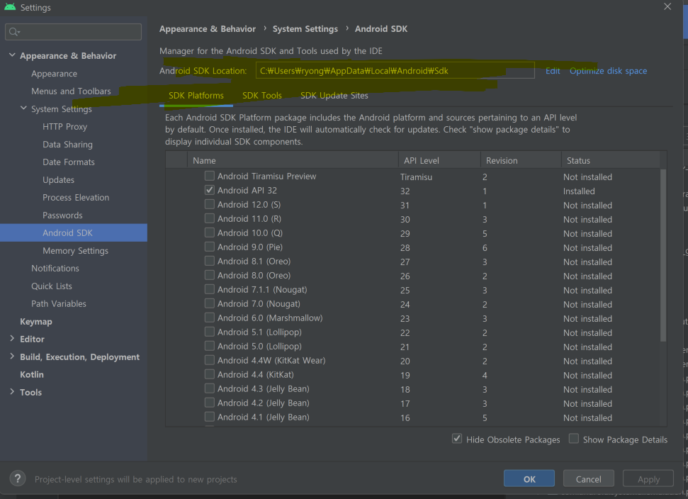 경로는 Android Studio ->SDK Manager (빨간 아이콘) ->Android SDK Locations에서 확인
