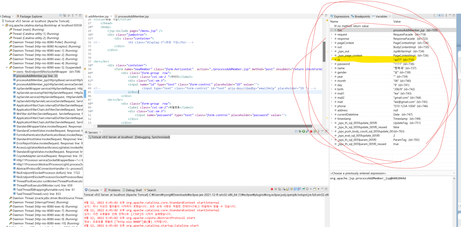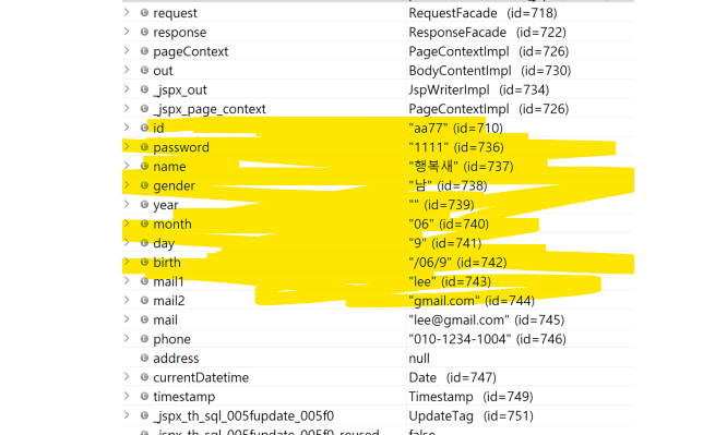 이클립스에서 JSP와 ORACLE(오라클) 데이터 베이스 연동 오류/ 일부 데이터가 JSP에서 오라클로 안넘어갈 때(NULL)/ 이럴 경우 디버깅하는 방법
