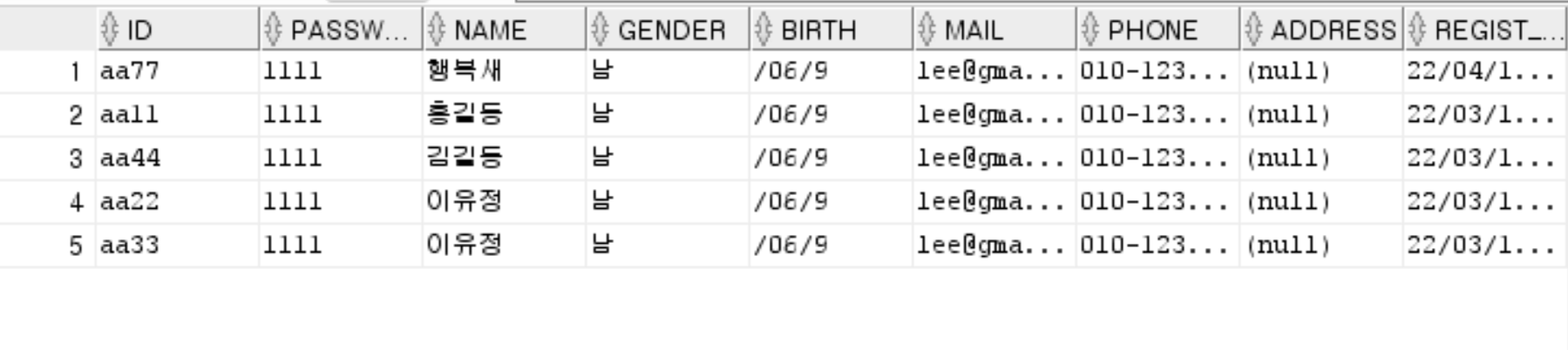 왜인걸, 다른 데이터들을 다 넘어가는데 회원 가입 부분에 ID 부분만 NULL이 되는 게 아닌가