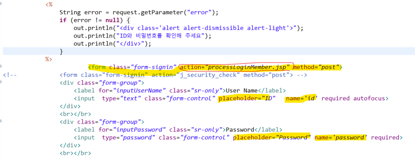 아래에서 로그인 정보(id, password) 는 action="processLoginMember.jsp"로 넘어가고