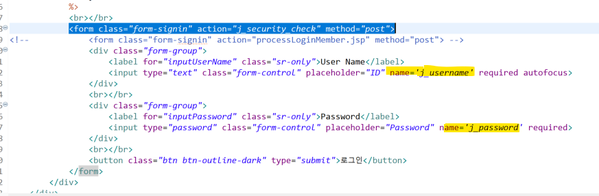 사용자 이름과 비빌 번호의 name 속서어 값을 j_username, j_password로 작성한다.