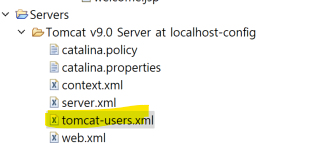Servers - Tomca v9.0 Server at localhost config - tomcat users.xml로 들어가